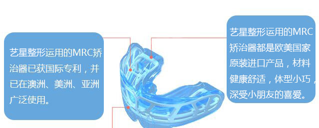 艺星MRC首要目标是实现儿童的肌肉软组织的正常运动,通过轻松 无负担的佩戴,对儿童牙列施加柔和的力量,刺激颌骨发育,解决 牙齿畸形等情况,是让孩子受益终生的选择。