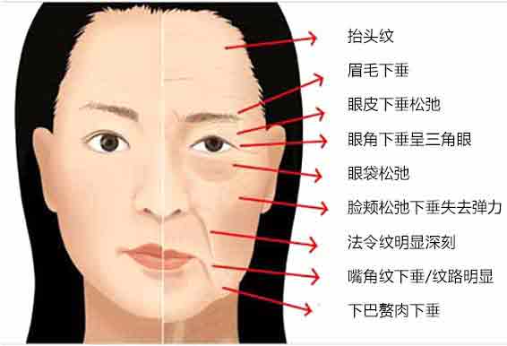 40岁以上面阔中心开始衰老 主要表现为:鼻唇沟、面部下垂、眼纹